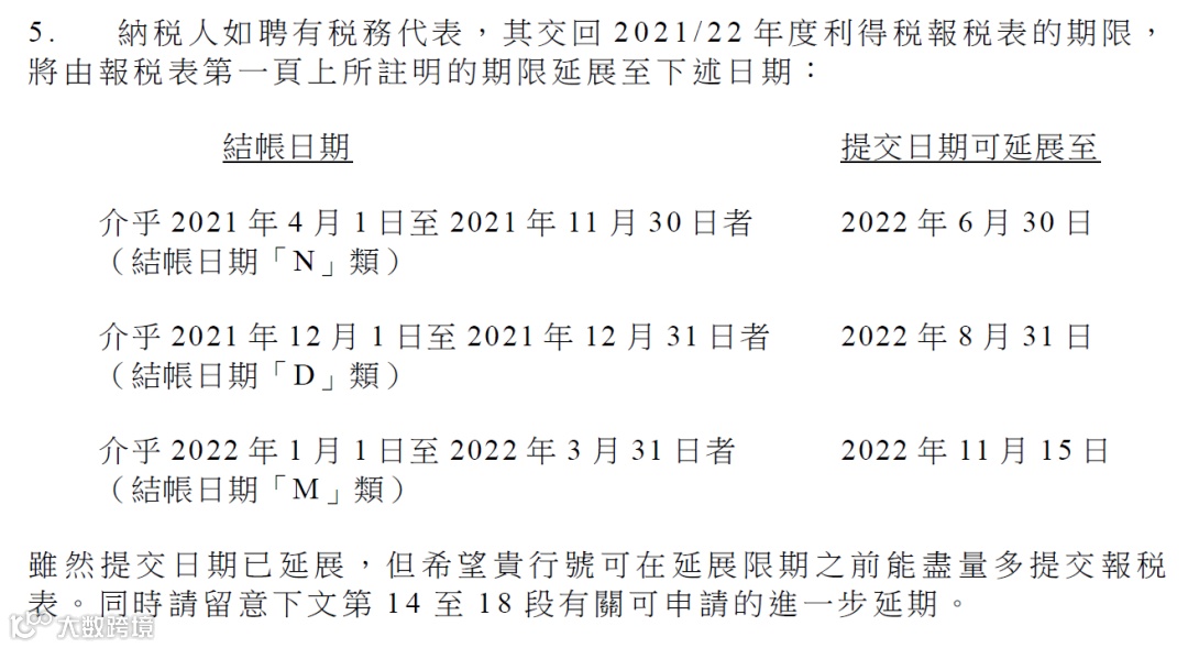 因疫情影响,2021/22年度税表交回2021/22年度利得税报税表的期限,将由报税表第一页所注明的期限延展至下述日期。