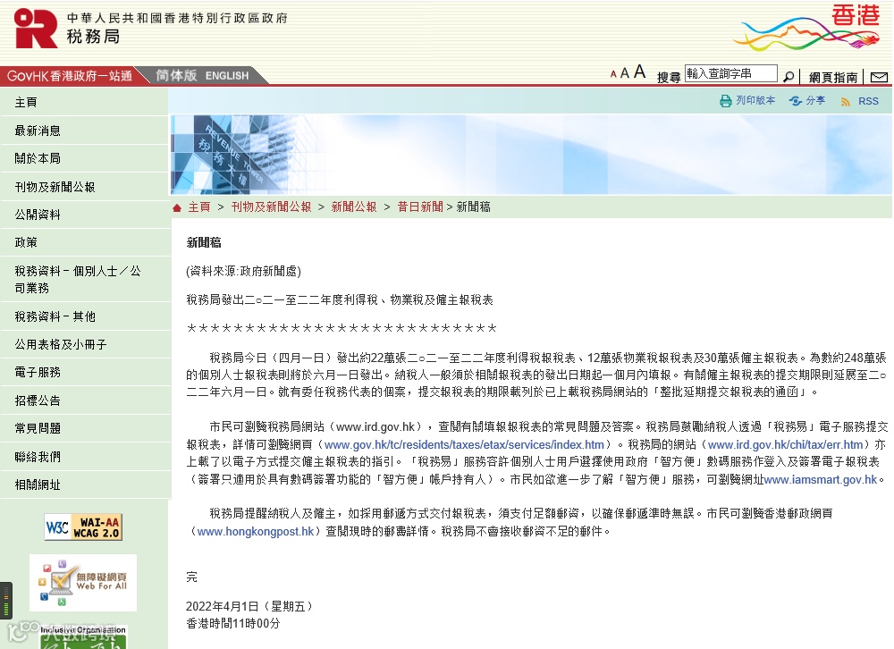 税务局于四月一日发出约22万张2021至2022年度利得税报税表、12万张物业税报税表及30万张雇主报税表。为数约248万张的个别人士报税表则将于六月一日发出。
