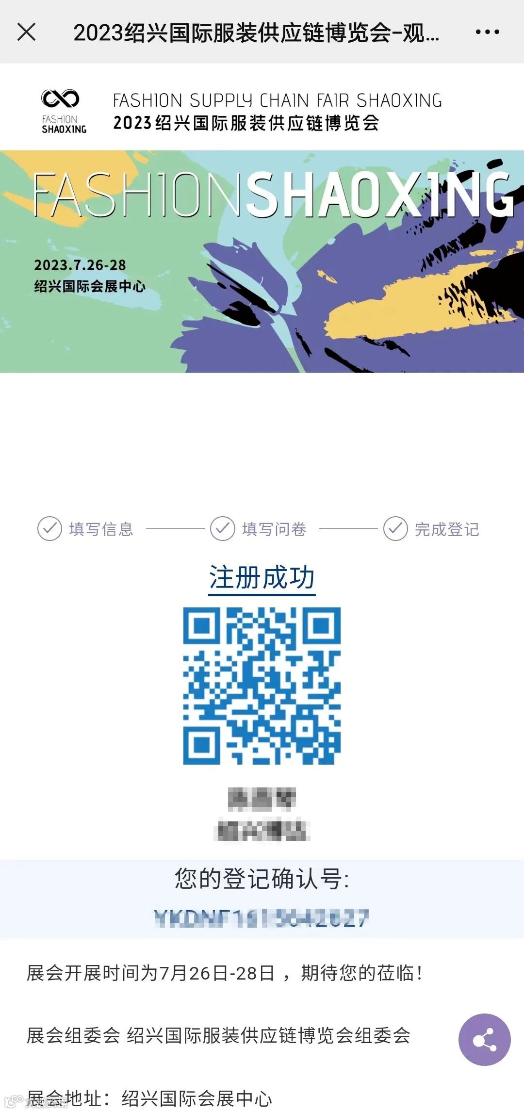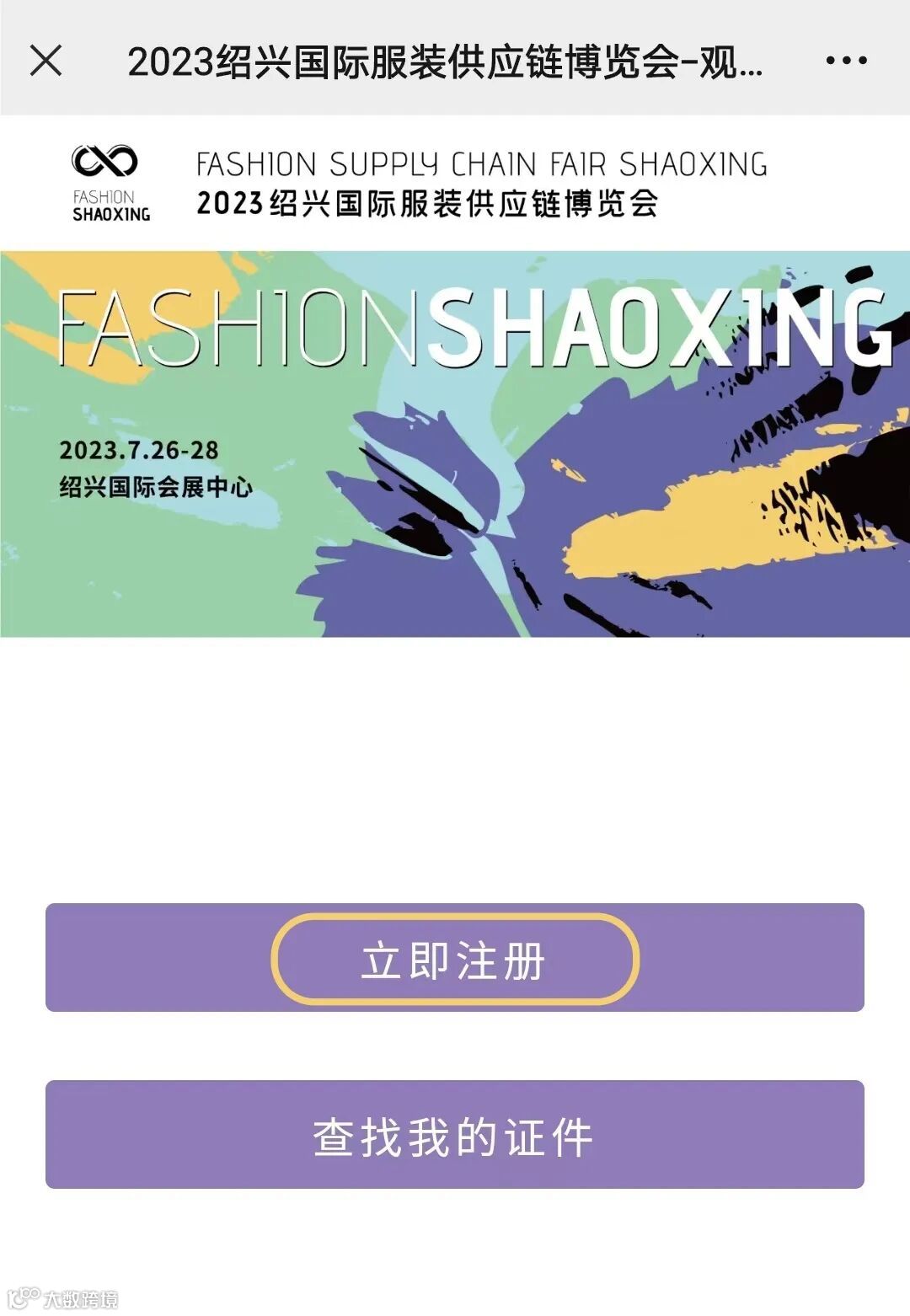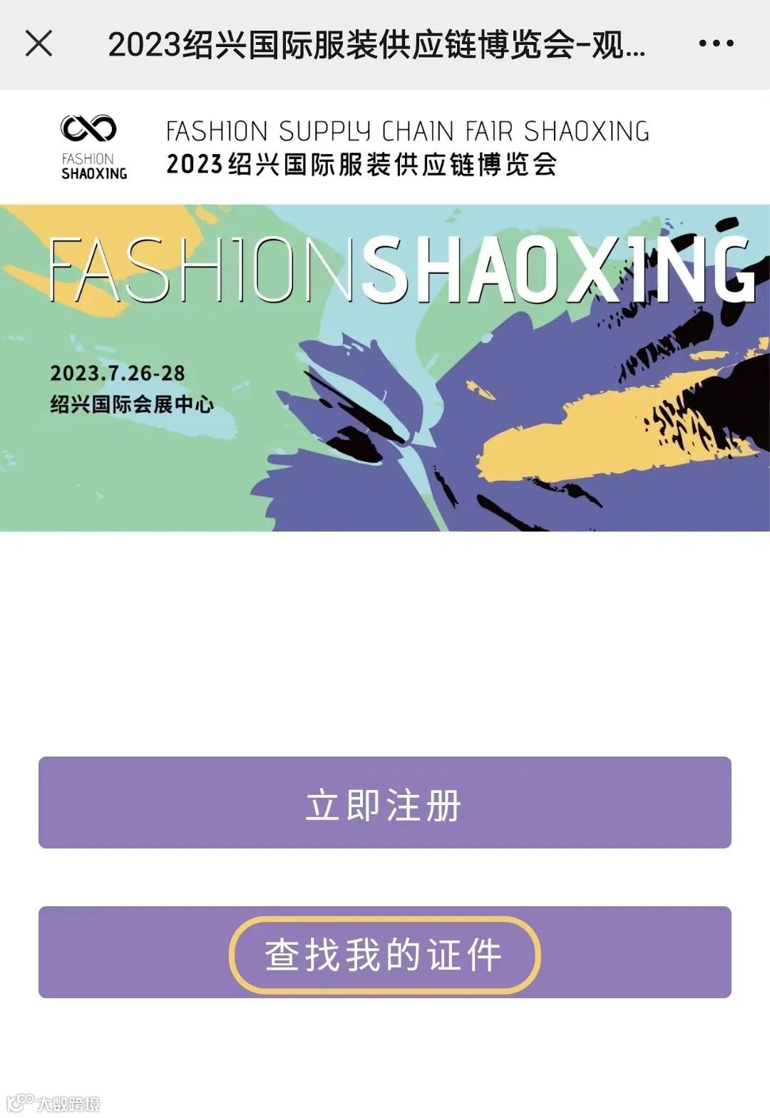 已注册完成的观众,可回到“时尚绍兴”公众号页面,点击“观众登记”回到注册页面,点击“查找我的证件”即可获取进场二维码