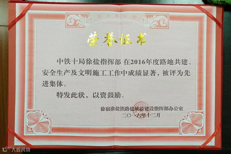 中铁十局人一步一个脚印,走出一串光辉的足迹,只有当事人才知道他们背后付出了多少艰辛与汗水。付出换来好成绩,在业主单位组织的全线检查中,中铁十局所在标段排名第一,信誉评价名列前茅,并获得江苏省铁路建设先进单位,盐城市重点交通工程“天路奖”,安全生产、文明施工“先进集体”,中国中铁股份有限公司项目文化建设示范点以及中铁十局“标准化文明工地”等荣誉。中铁十局人以一颗感恩之心让苏北人民的“高铁梦”越来越近!