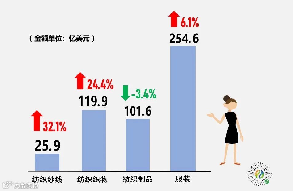 3月当月,我国纺织品服装出口220.5亿美元,同比增长16.8%(以人民币计同比增长15%)。其中,纺织品出口118.3亿美元,同比增长22.4%(以人民币计同比增长20.5%),高于全国货物出口同比增速7.7个百分点;服装出口102.2亿美元,同比增长10.9%(以人民币计同比增长9.2%),增速较去年四季度有所回落。