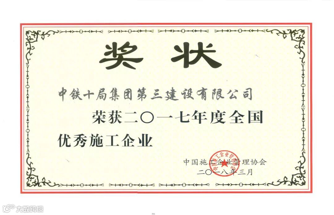 三月份,公司荣获2017年度”全国优秀施工企业”称号。这是公司第五次荣获此奖项,也是公司连续第三年荣获此奖项。