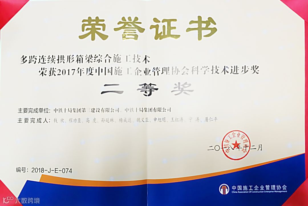 多跨连续梁拱箱梁综合施工技术荣获中国施工企业管理协会科学技术进步奖二等奖,是全局获得的唯一一项。