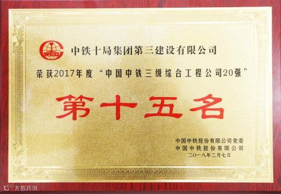2月17日,公司荣获2017年度“中国中铁三级综合工程公司20强”第十五名。