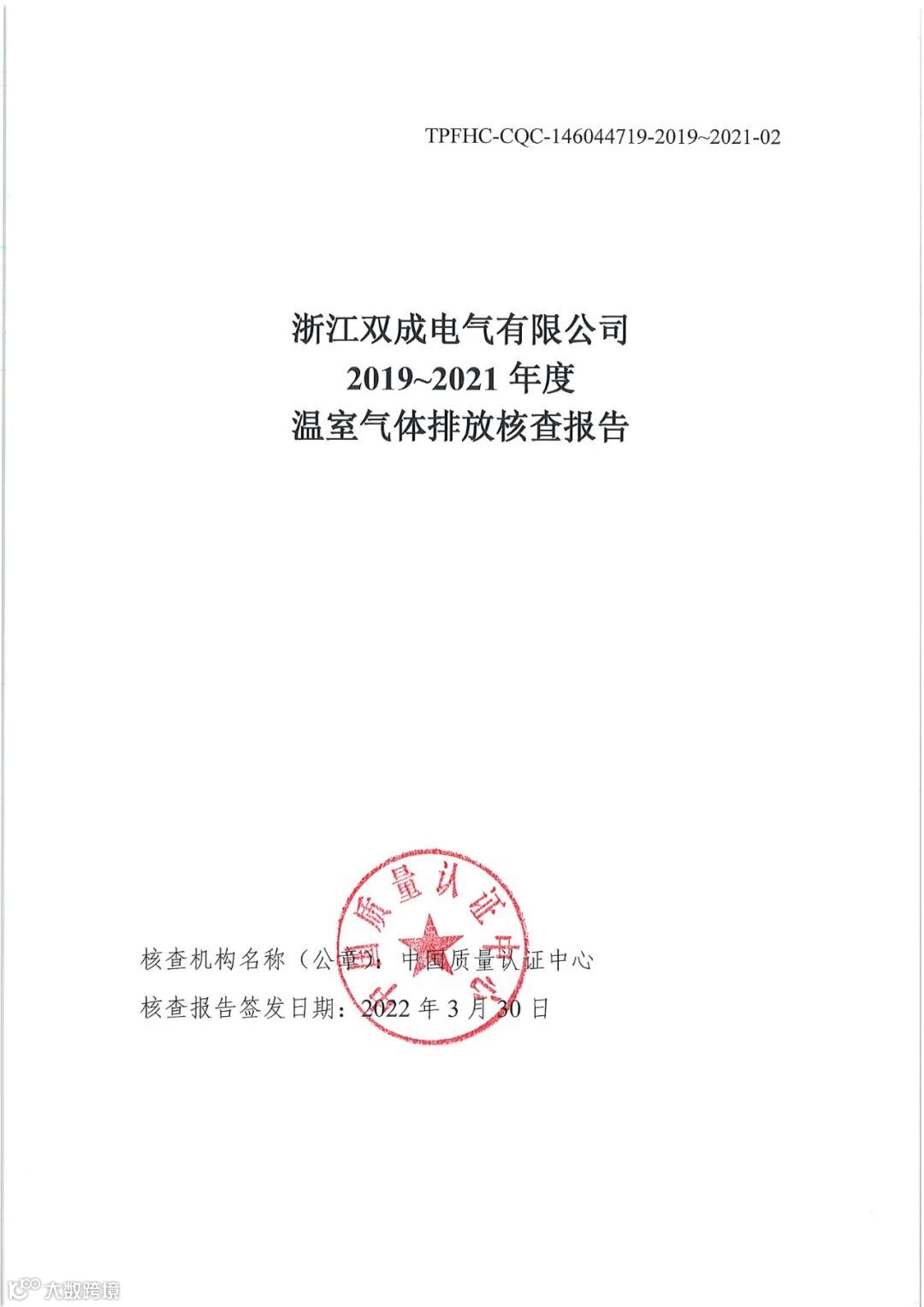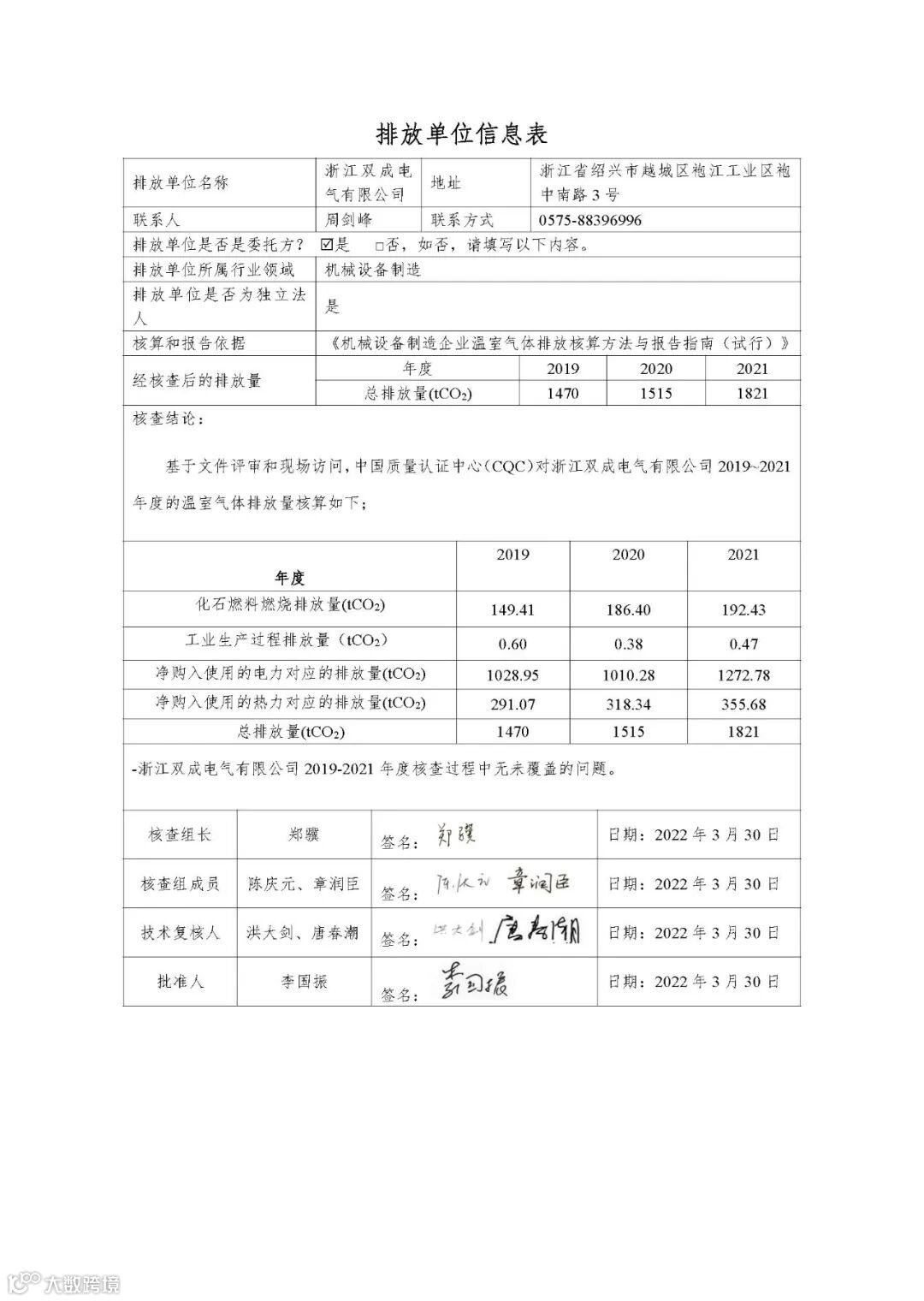 近期,浙江双成电气有限公司委托中国质量认证中心,根据《机械设备制造企业温室气体排放核算方法与报告指南(试行)》对公司的温室气体排放进行系统的、独立的评价,并成功完成温室气体排放核查报告。主要核查内容包括化石燃料燃烧排放量(tCO2)、工业生产过程排放量(tCO2)、净购入使用的电力对应的排放量(tCO2)、净购入使用的热力对应的排放量(tCO2)、总排放量(tCO2)等。