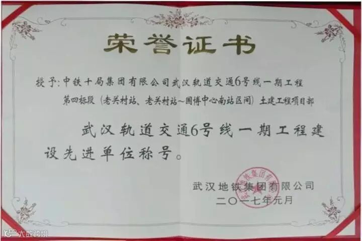 2017年1月10日,武汉地铁集团组织召开的武汉轨道交通机场线、6号线一期工程建设表彰大会在武汉轨道交通线网管理服务中心报告厅隆重召开。武汉市副市长张光清、武汉市副秘书长彭涛,地铁集团有限公司董事长周少东及各单位领导出席会议。中铁十局副总经理杨志明、三建公司总经理魏广造应邀参加。会议认为,中铁十局武汉轨道交通6号线一期工程第四标段土建工程在建设过程中表现突出,决定授予“先进单位”荣誉称号。获得此次表彰为企业在武汉市场滚动发展奠定了坚实的基础。