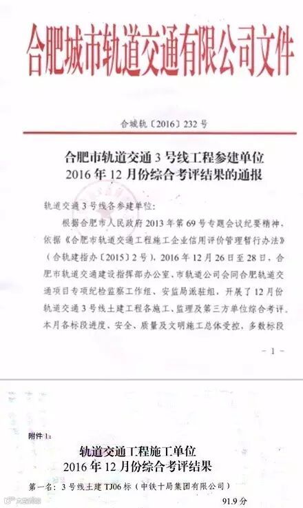 合肥地铁3号线6标荣获合肥市轨道交通3号线12月份综合考评第一名