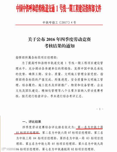 近日,呼市地铁1号线1标在业主2016 年四季度劳动竞赛考核中获得第一名,获得奖励74.15 万元,为公司赢得荣誉。