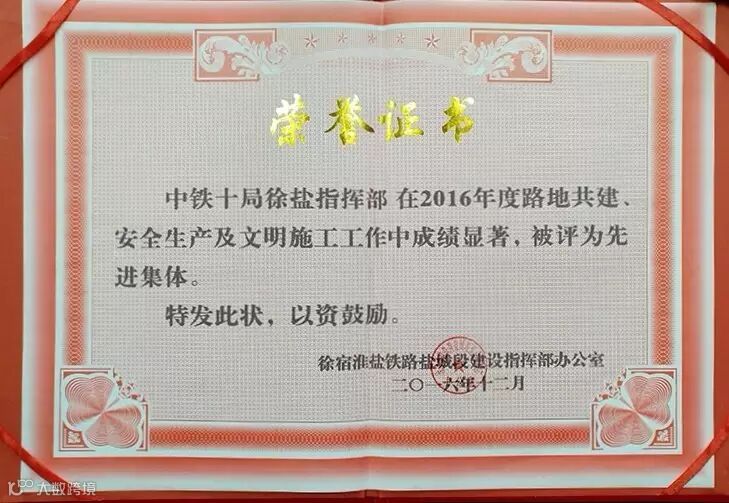 近期,徐盐铁路喜讯不断,在盐城市交通局和盐城市铁路办2016年度评比中硕果累累。在盐城市交通局表彰2016年度交通重点工程先进集体和先进个人中,徐盐铁路因在“6.23”阜宁龙卷风抢险救灾中表现突出,荣获2016年度盐城市重点交通工程“爱心奖”;徐盐铁路建湖制梁场场长杨帆因在2016年盐城市交通建设中成绩优异,荣获2016年度盐城市重点交通工程“天路奖”;在盐城市铁路办表彰2016年度铁路重点工程先进集体和先进个人中,项目部荣获盐城市铁路办2016年度施工单位路地共建及安全生产、文明施工“先进集体”称号,徐盐铁路指挥部指挥长张汪钊荣获盐城市铁路办2016年度施工单位路地共建及安全生产、文明施工“综合先进个人”称号,崔毅、余泽江等12人荣获盐城市铁路办2016年度安全生产文明施工“先进个人”称号。