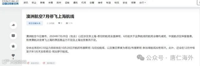 中国民航航空网报道称,除了2024年7月28日(包含)以后涉及到上海-悉尼的航班全面停班以外,自6月起关于这条航线的航班会随机减班,中国航点仅保留香港。