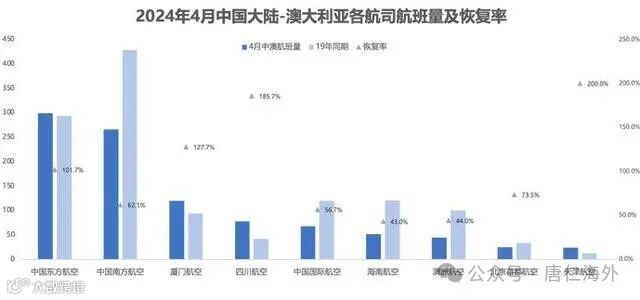 疫情后,国内航司的闲置宽体机也更多投入澳洲市场,造成双方航班差距进一步拉大。