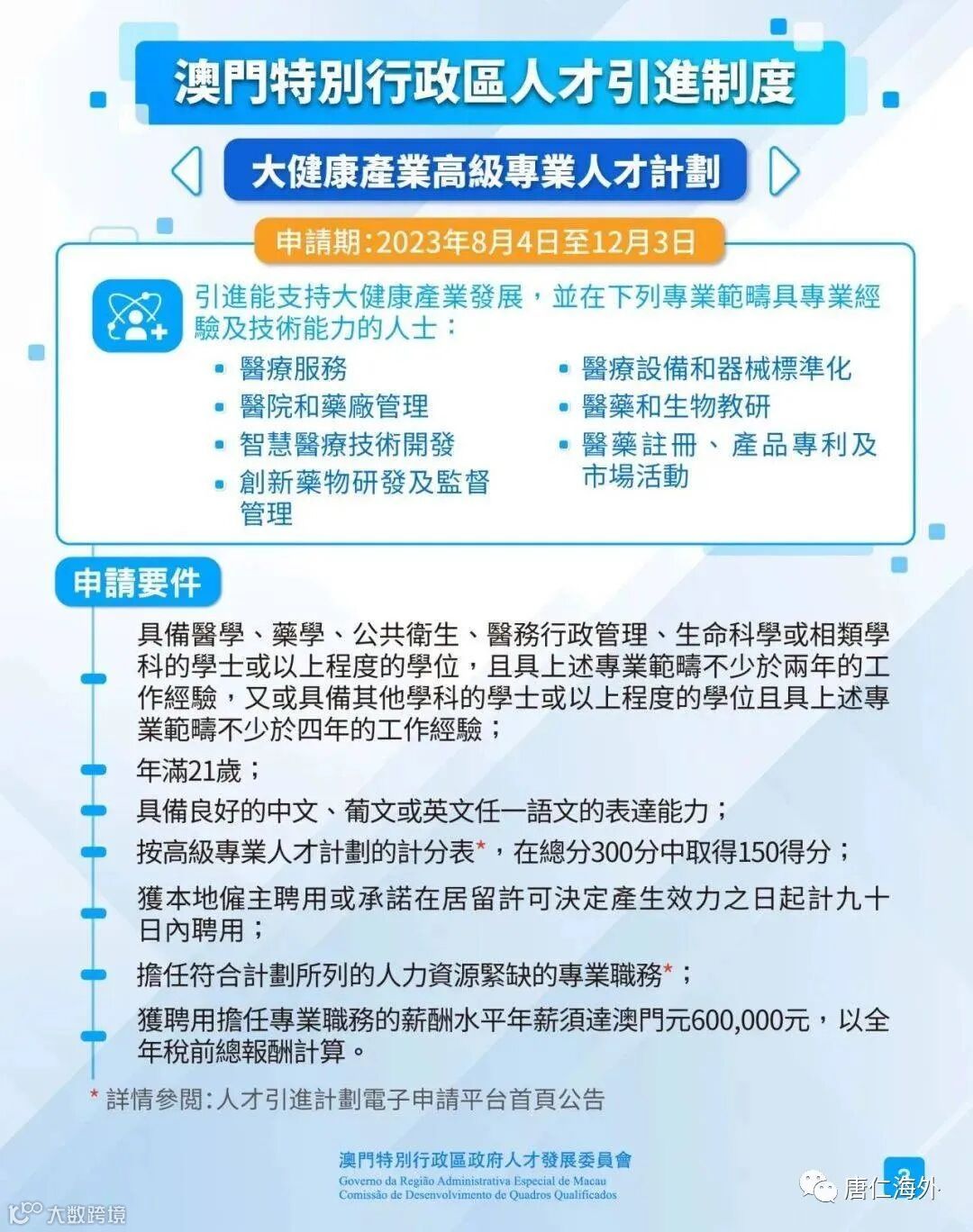 包括低税制、15年免费教育、医疗和社会保障等,持澳门特区护照享有超过140个国家和地区的免签证或落地签证待遇。同时,研究开发的科研人才可向特区政府申请科研资助。而对于引进人才享有税务优惠,法案亦作出了明确规范。澳门发布了人才引进计划的首批细则,主要集中在“