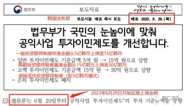 早在5月初,韩国法务部发布公告,将房地产投资移民制度的实行期限延长3年,投资金额从5亿韩元提高至10亿韩元。同时,将“房地产投资移民制度”更名为“旅游、休养设施投资移民制度”。