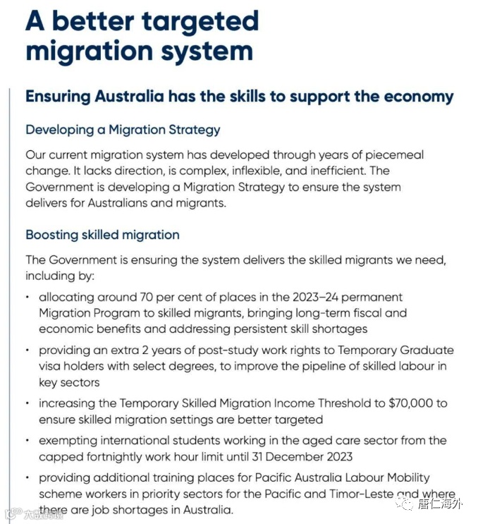 为了进一步解决员工短缺问题,预算开放了移民流,包括技术移民,以提供一些技能救济。对于 2023-24 永久移民计划,政府将规划水平恢复到 190,000 个名额的长期水平,并将 137,100 个名额(约 70%)分配给技能流,以帮助解决澳大利亚的长期技能需求。而一直传言的要改革移民分算法,近期应该就要公布啦!