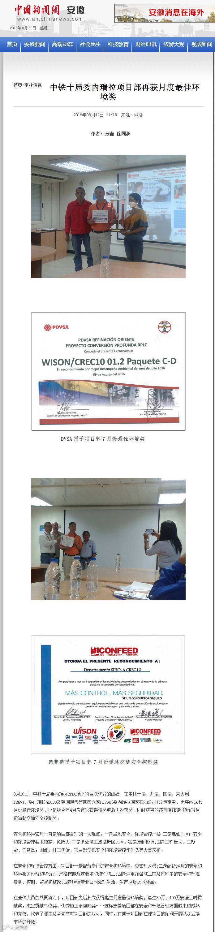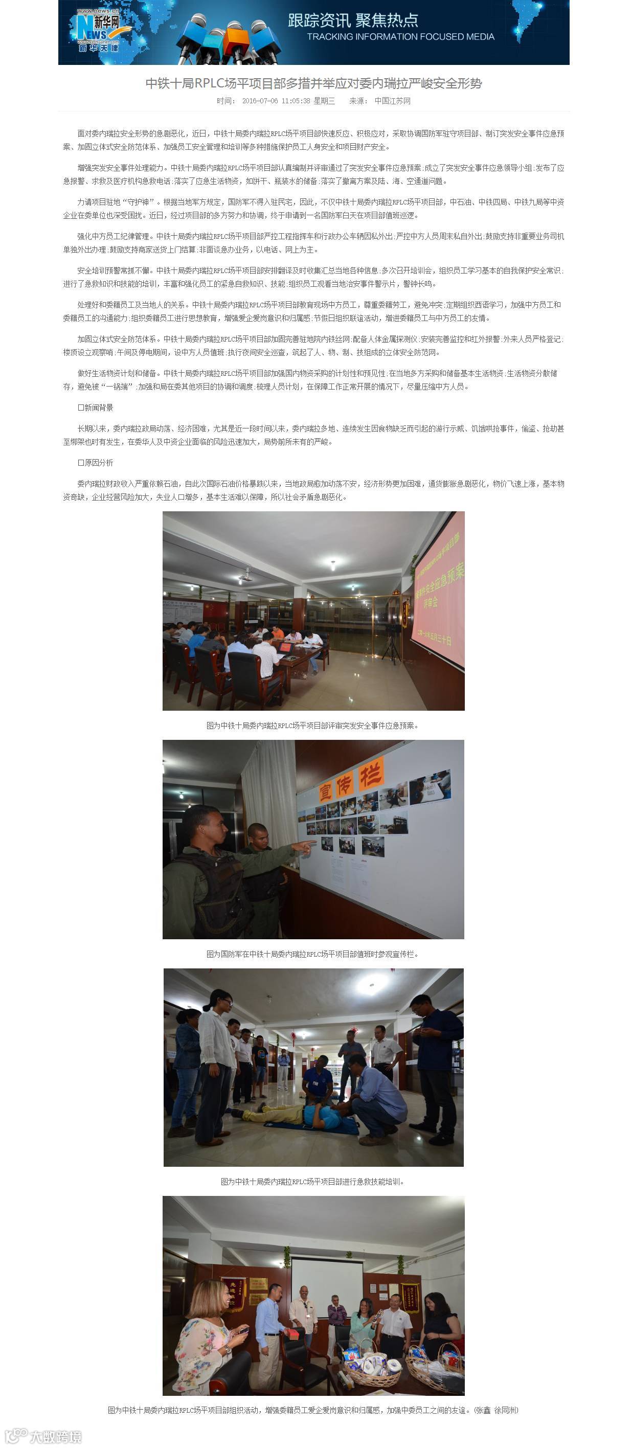 今天,小编推出的这期“海外之声”借助中铁十局三建公司委内瑞拉RPLC项目部的几篇新闻报道(节选),一是为了展现企业海外建设者在异国他乡的不易和伟大。为了企业的发展,他们“背井离乡”,贡献自己的智慧,奋勇拼搏,奉献自己的力量。二是鼓励和引导更多的基层各单位员工,尤其是宣传干部,能够更加重视新闻报道工作、更加积极地参与新闻报道工作,能够围绕重点工程、重大事件、重要活动、节点工期等多撰写有价值的新闻稿件,不断讲述企业好故事,传播企业好声音,树立企业好形象。据统计,委内瑞拉RPLC项目部仅仅在两个多月的时间内,在中新社、新华网等中央级网站和人民铁道网等行业媒体网站刊发稿件20余篇,既有力地传播了中铁十局三建公司在委内瑞拉的工程建设业绩,也展示了中铁十局三建公司海外建设者的靓丽风采;既传递了十局“海外之声”,也树立了十局“海外品牌”。