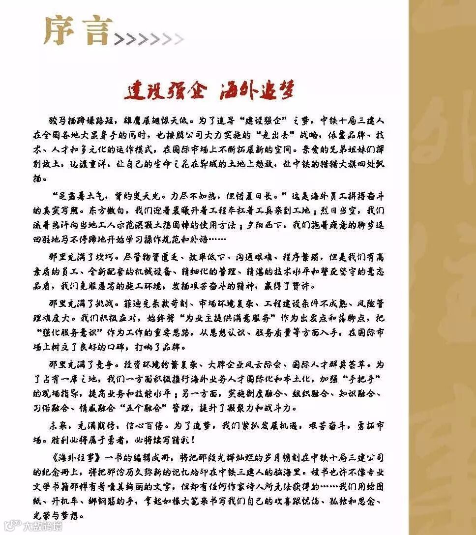 为了传承企业投身海外建设的历史,展现海外建设者远渡重洋的艰辛和不易,激发更多干部职工投身海外建设的热情,全面展示海外风土人情和建设者风貌,三建公司党委、三建公司出版发行了《海外往事》一书。该书通过图文并茂的形式,深入挖掘了三建公司海外工程建设的感人故事和宝贵经历,集中体现了无数三建公司海外建设者历尽千辛万苦开辟企业走向海外的光辉历程。该书在公司一经发行,深受广大干部职工好评。