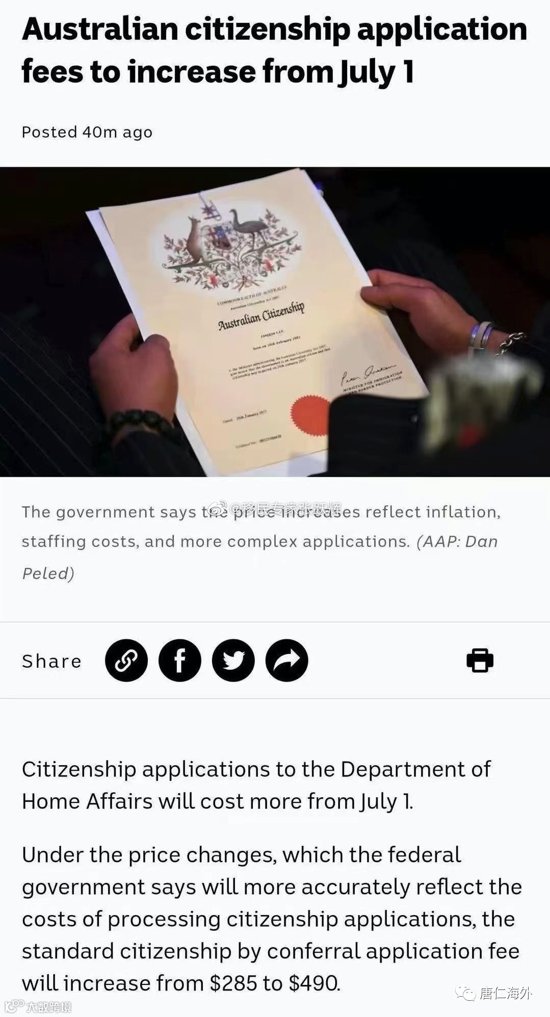 导读:7月1日澳大利亚🇦🇺 新财年起,澳入籍申请费将由285澳元上涨到490澳元,涨幅超过70%