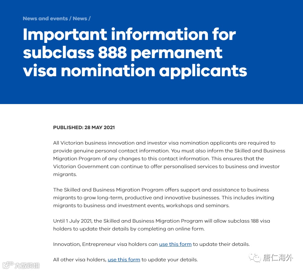 在 2021 年 7 月 1 日之前,188 签证持有人可以在线填写表格来更新自己的详细信息。从7 月 1 日起,维州政府将要求提供 888 类申请人或其配偶在抵达维州后 1 个月内联系维州政府技术和商业移民项目组,并在888提名申请时提供相关证据。如果未提供此信息,则 888提名申请可能会被拒绝。维州政府表示会根据隐私声明使用这些信息。