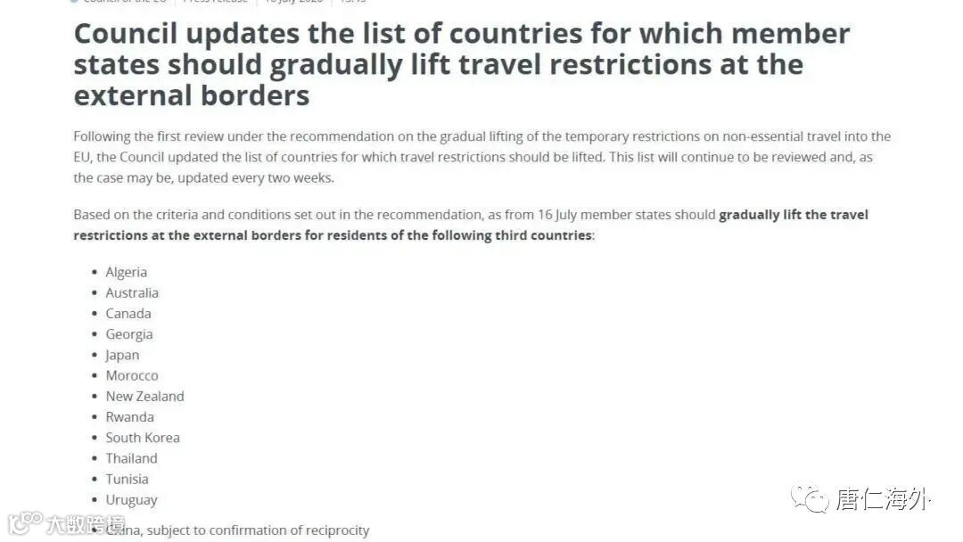 导读:欧盟建议成员国即日起对12个国家开放外部边界,对中国附带条件开放边界。该名单仍然将美国排除在外。