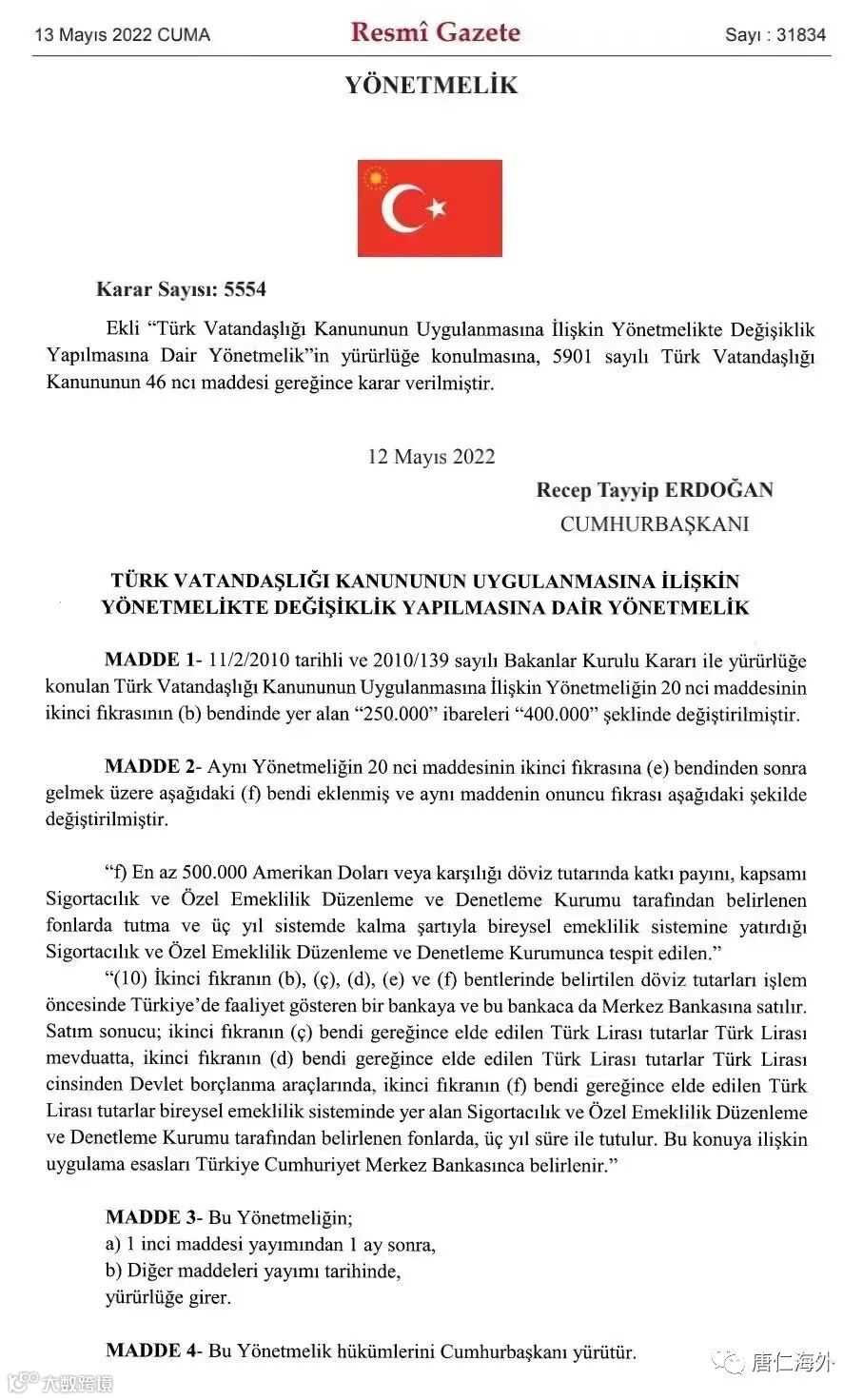 在高通胀的背景下,虽然房价也在快速抬升,但毕竟没法跑过里拉的贬值速度,所以以外汇计算的话,土耳其的房价几乎每天都在降价。同时,由于土央行不断降息,购房贷款的利率也十分诱人。有鉴于此,总统雷杰普·塔伊普·埃尔多安(Recep Tayyip Erdogan)领导的总统内阁讨论了提高必须购买的房地产价值以获得特殊土耳其公民身份的问题。在内阁会议上,决定将申请特殊土耳其公民身份的房地产价值从25万美元增加到40万美元。在这项决定的范围内,设想将修正《土耳其公民法执行条例》第20条的“b”节,其中载有获得土耳其公民身份的规定。购买了至少40万美元或等值外币房子的购买者,至少40万美元或等值的外币金额已提前存入,将能够根据总统的决定获得土耳其公民身份。唐仁海