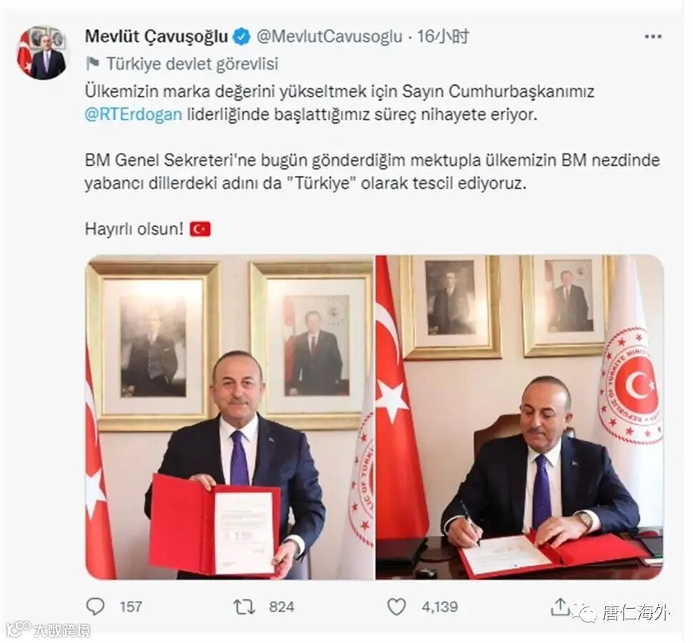 土耳其为提高土耳其品牌价值而发起的国名变更进程已经有了结果。联合国秘书长发言人迪雅里克6月1日说,联合国已经正式批准土耳其将其外文国名由Turkey更改为Türkiye的请求,更名从收到土耳其外长恰武什奥卢致信的那一刻起生效。