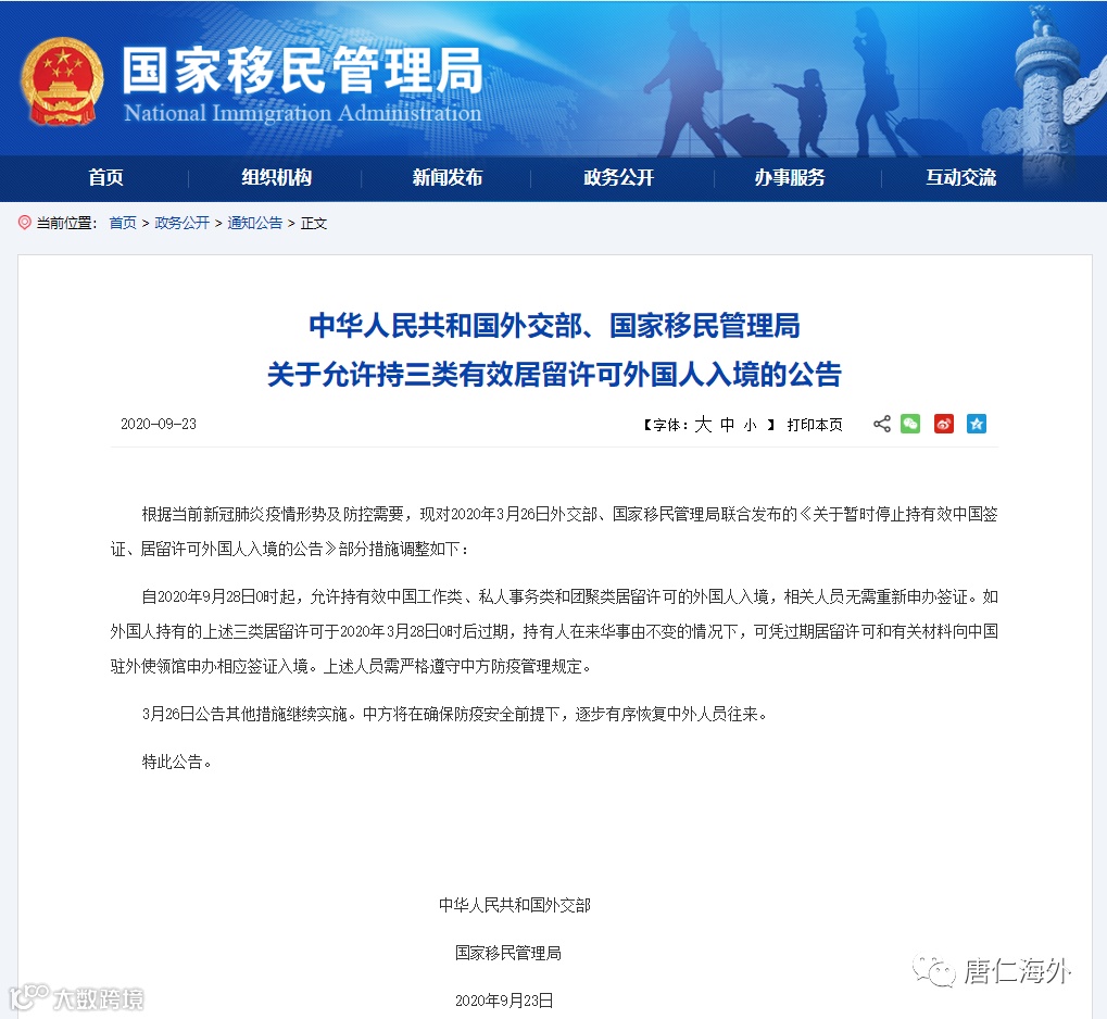 自2020年9月28日0时起,允许持有效中国工作类、私人事务类和团聚类居留许可的外国人入境,相关人员无需重新申办签证。如外国人持有的上述三类居留许可于2020年3月28日0时后过期,持有人在来华事由不变的情况下,可凭过期居留许可和有关材料向中国驻外使领馆申办相应签证入境。上述人员需严格遵守中方防疫管理规定。