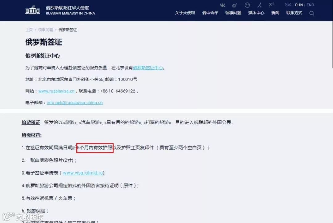 俄罗斯:需要提供在签证有效期届满日期后6个月内有效的护照