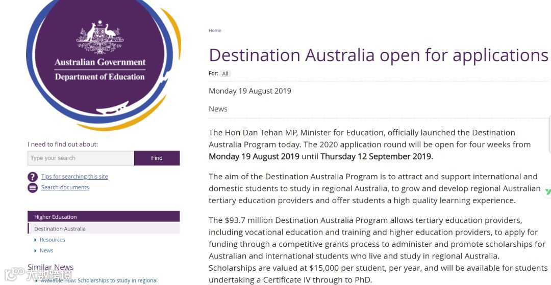 为了回报金主/鼓励留学,也为了鼓励移民流向偏远地区,联邦政府创立了“DestinationAustralia”奖学金项目,每年将给在偏远地区大学或TAFE学习的学生提供总价值1,950万澳元的奖学金。