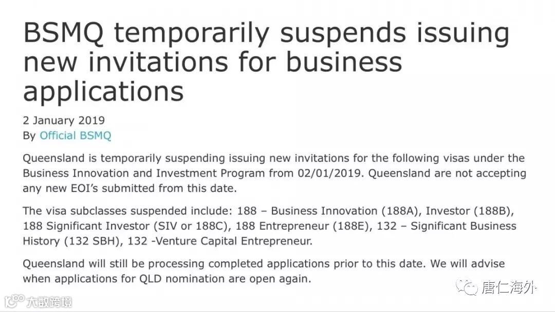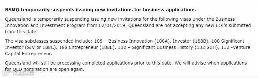 据澳洲昆士兰州(布里斯班)官方公布,2019年1月2日,昆州关闭全系列商业投资移民申请,不再接受新递交的EOI。受影响签证包括132A\B、188A、188B、188C、188E!这是继新南威尔士州(悉尼)后,一个月内又一个地区宣布关闭商业投资移民申请。