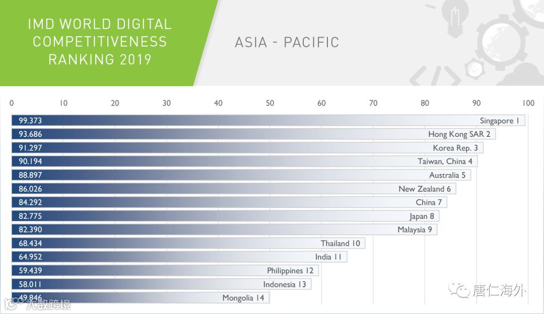 瑞士洛桑国际管理发展学院近日发布2019年度IMD全球数字竞争力排行榜(WDCR)。今年,美国继续蝉联榜单第一,前五名依旧是美国、新加坡、瑞典、丹麦和瑞士。亚太地区表现亮眼,多个经济体排名大幅上升,中国香港与韩国首次跻身前十名,中国大陆排名从第33位上升至第22位,是整体排名提升幅度最大的经济体,而澳大利亚下滑一位至第14位。