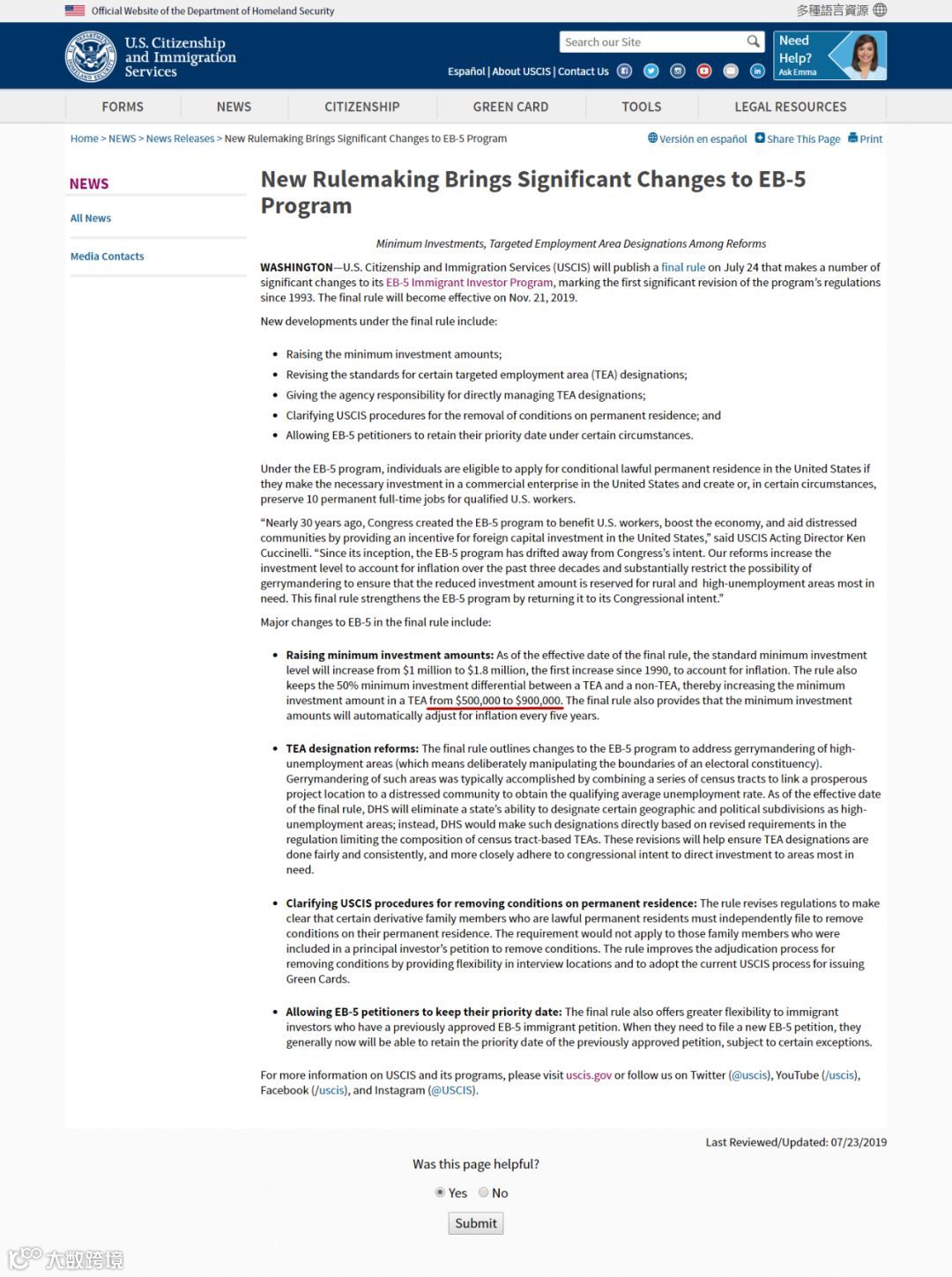 USCIS宣布于7月24日针对EB-5移民投资项目的重大修改,进行最终判决。此次修改就标志着美国政府自1993年以来,针对投资移民项目做出的首次重大修订,其最终法规将于2019年11月21日正式生效。