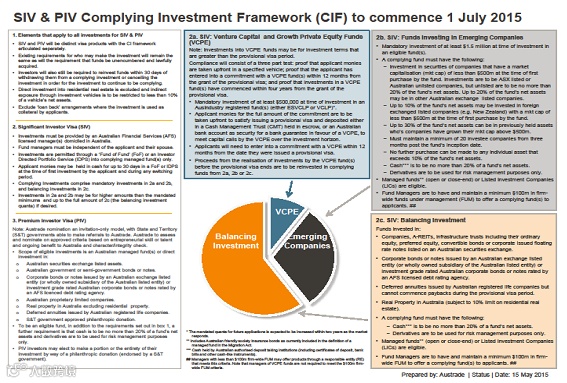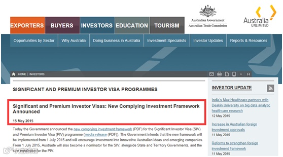 2、澳洲政府将于2015年7月1日引入新的高端投资者类签证(PIV),投资额要求高达1500万澳币。通过PIV签证,澳洲政府希望吸纳精英企业家和创新投资家。澳大利亚贸易委员将承担PIV签证申请的提名工作。PIV类别将为海外投资者提供更快捷的永居通道,即投资人有望通过PIV签证在12个月内获得澳洲绿卡。