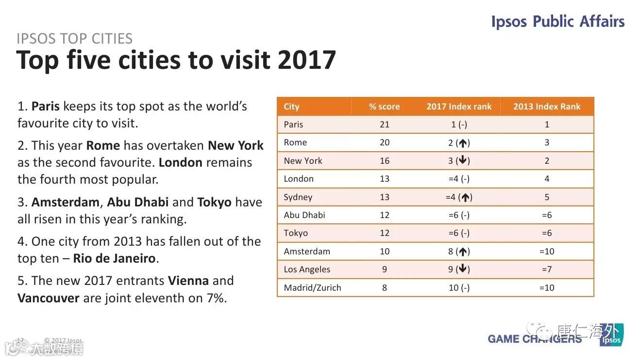 另一项涉及全球1.8万人和60个城市的调查显示,悉尼和伦敦在全球最佳旅游城市排名中并列第四,仅排在巴黎、罗马和纽约之后。东京和阿布扎比市(Abu Dhabi)并列第六,阿姆斯特丹第八,洛杉矶第九,马德里和苏黎世(Zurich)并列第十。在这次调查中,悉尼是唯一参与评比的澳洲城市。