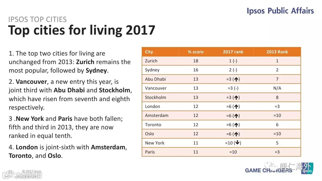 2017年益普索顶级城市指数(2017 Ipsos Top Cities Index)显示,悉尼荣登全球最宜居城市第二名。摘得桂冠的是瑞士苏黎世。