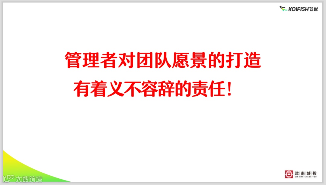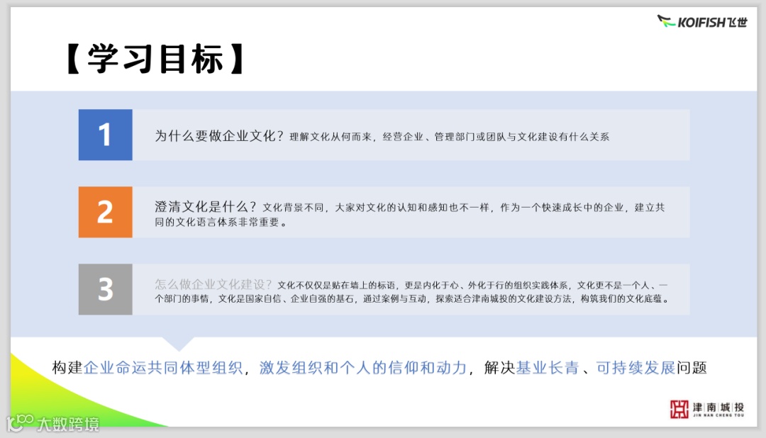 2023年10月20日,飞世KOIFISH创始人齐欣老师受邀为天津津南城市建设投资有限公司(以下简称“津南城投”)以“企业文化管理,打造‘城投文化’”为主题,进行了培训分享,助力津南城投进一步加强公司企业文化建设,加深母子公司对企业文化的理解和认同。