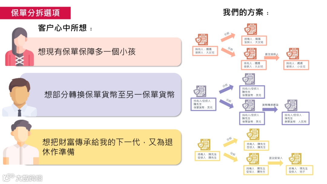 保单分拆功能让保单更灵活、传承功能更强:二胎家庭可以把保单一拆二,同时保障两个孩子;投资者可分拆保单,结合货币转换功能,同时配置多种货币资产;家里长辈可分拆保单,结合更换受保人功能,部分财富用来养老,部分财富用来传承。