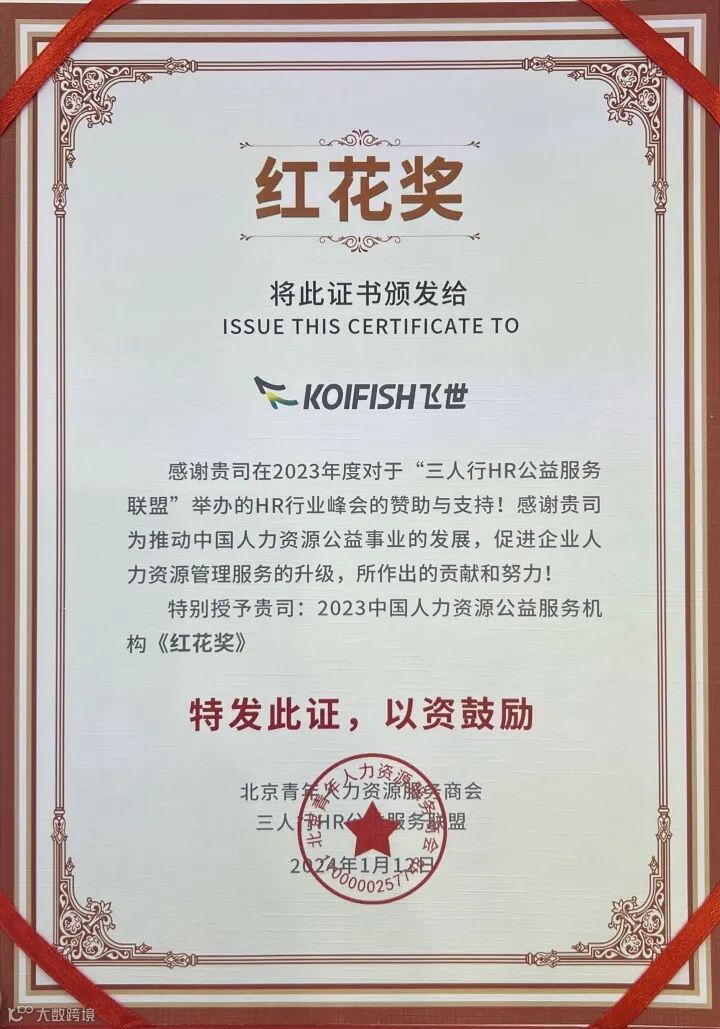 2023年,飞世KOIFISH不忘初心,砥砺前行,持续推动中国企业管理服务与人力资源公益事业的发展,不断促进企业管理与人力资源服务的创新、转型与升级,荣获“2023年中国人力资源公益服务机构『红花奖』”。