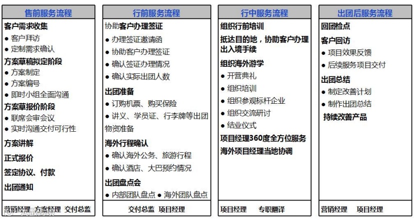 行程保障上,以 “为客户打造海外游学完美体验” 为理念,建立了包含 500 余个标准流程节点的全流程服务体系,实行 “项目经理负责制”,40 余位专业人员组成的后台支持团队将提供从售前需求沟通、方案定制,到行前签证办理、物资准备,再到行中行程组织、全方位协调,以及行后回访反馈、持续服务的全周期保障。