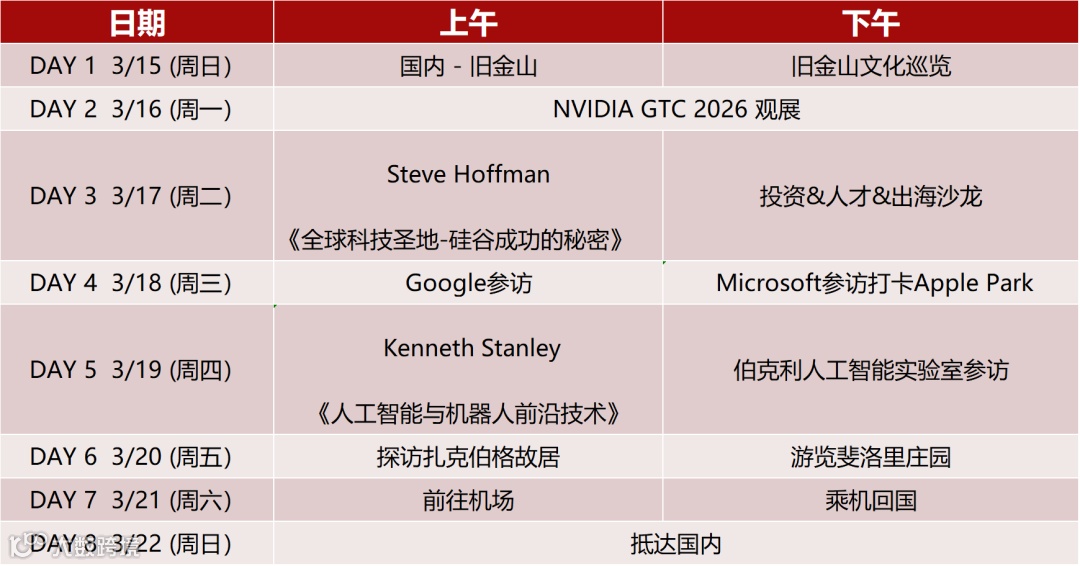 2026 年 3 月,让我们一起,走进硅谷,对话前沿科技,链接全球资源,在 AI 时代的浪潮中,找到企业发展的新方向、新机遇。名额有限,即刻报名,开启你的硅谷 AI 创投深度研学之旅!