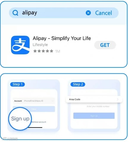 Download the Alipay App, click [Register Account], and select [International Version].