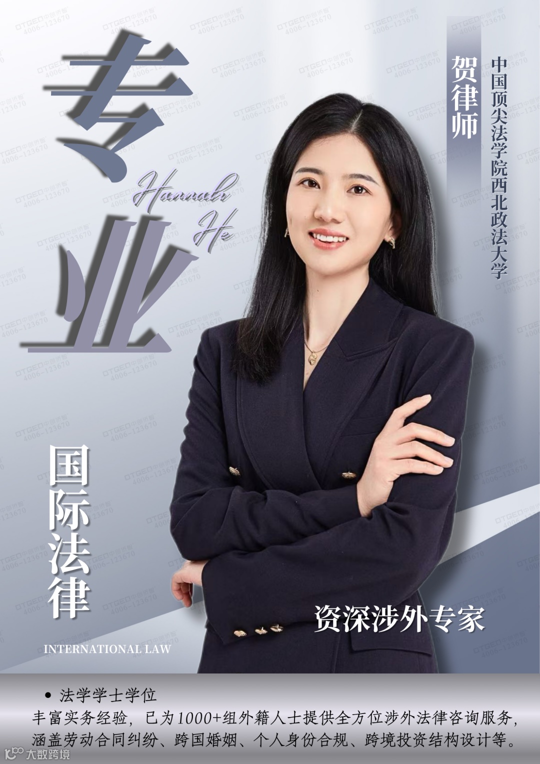 🎓 Graduated from Northwest University of Political Science and Law in China, a senior foreign-related legal expert who has served thousands of groups of foreign nationals! At the same time, as a cooperative lawyer of OTGEO, Lawyer He joins hands with OTGEO. Relying on rich cross - border resources and professional platforms, she provides foreign - related legal services to help more clients solve problems.