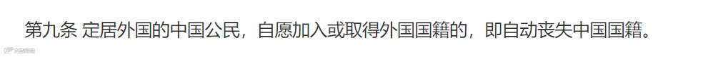 According to Article 9 of the Nationality Law of the People's Republic of China, any Chinese citizen who has settled abroad and voluntarily acquired foreign nationality shall automatically lose Chinese nationality.