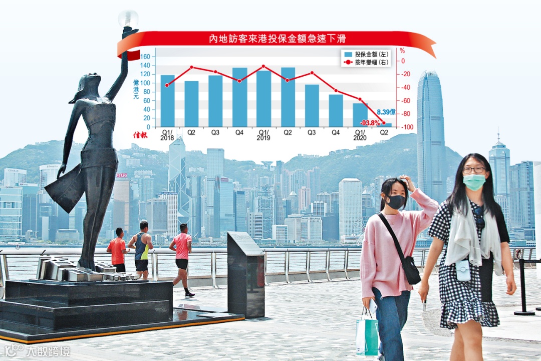 由于跨境人流持续受到限制,源自内地访客的新造保单保费从第一季的54亿元收缩84.5%至第二季的8.39亿元,上半年整体下跌76.3%至62亿元,佔个人业务总额9.6%。此顾客群组投保的保单中约98%以非整付方式支付(即非一笔过支付),而危疾、终身寿险及储蓄寿险分别佔这些保单的49%、36%和5%。