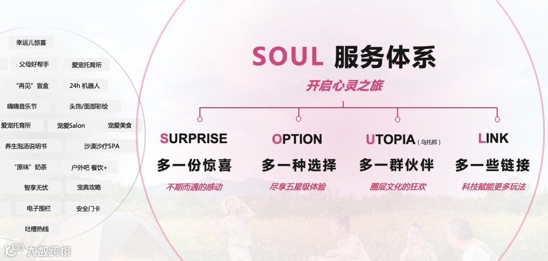 休闲度假产品线-「SOUL服务体系」:开启心灵之旅,通过惊喜、选择、圈层与链接,打造沉浸式情感体验;