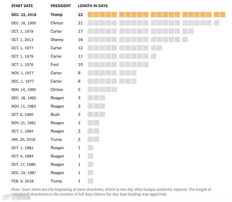 此前最长的一次停摆是在1995年,共和党与克林顿在七年预算平衡方案的经济预测数据上存在分歧,造成政府关门21天。