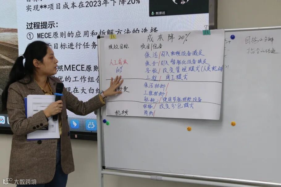 各小组进行任务演练,以“降本增效”主题,把握MECE原则,进行目标拆解,列出推进计划,并上台演示讲解,进一步深化对计划、推进、改善三板斧的认识,持续提升管理的成熟度。