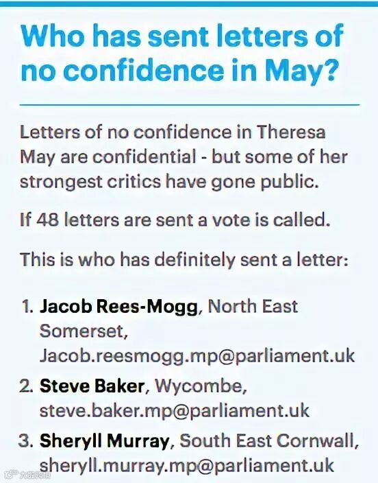 梅的首相之位依旧危险,据《泰晤士报》报道,至今已有25名保守党议员发函提出对首相特雷莎梅的不信任动议,且这25名议员姓名名单已公布。