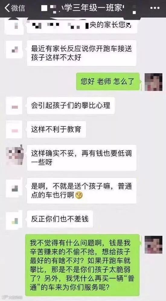 @噹噹和七喜:设想一下,如果群里每个家长都有能力开跑车送孩子,上学还会有这个问题么?就是典型的吃不到葡萄说葡萄酸,更好的物质生活难道你老师不追求?自己达不到就要求别人不能用。开跑车上下学对他来说是生活,对老师来说是显摆。人家说的一点都没错,没偷没抢,凭什么为你再买一辆所谓的普通车。