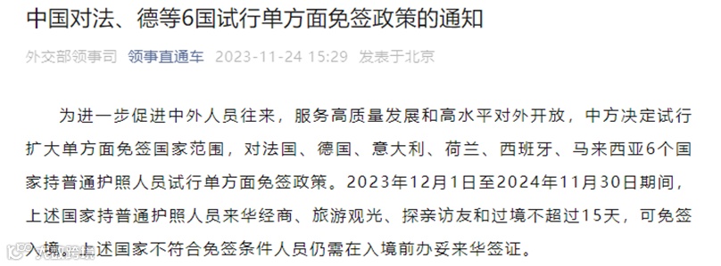 11月24日,领事直通车官微发布消息称,为进一步促进中外人员往来,服务高质量发展和高水平对外开放,中方决定试行扩大单方面免签国家范围,对法国、德国、意大利、荷兰、西班牙、马来西亚6个国家持普通护照人员试行单方面免签政策。