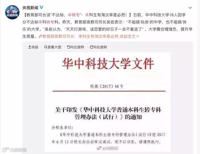 《人民日报》的报道,两天前,985名校华中科技大学发布一则通告,决定把18名学生的本科学历转成专科。